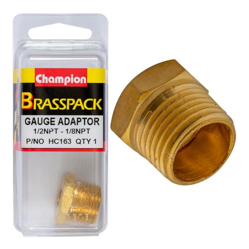 HC163 | Champion Brass Gauge Adaptor 1/2 NPT Male to 1/8 NPT Female Specification • Brass • 1/2in NPT male to 1/8in NPT female • Pack Size: 1