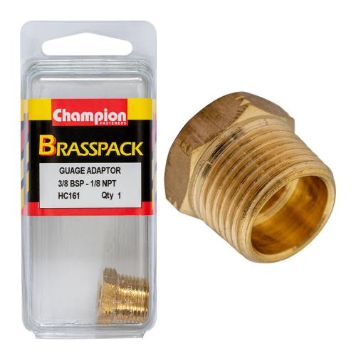HC161 | Champion Brass Gauge Adaptor 3/8 BSP Male to 1/8 NPT Female Specification • Brass • 3/8in BSP male to 1/8in NPT female • Pack Size: 1