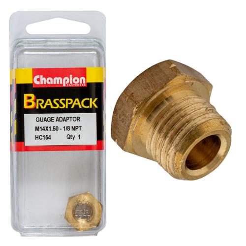 HC154 | Champion Brass Gauge Adaptor M14x1.50 Male to 1/8 NPT Female Specification • Brass • M14 x 1.50 male to 1/8in NPT female • Pack Size: 1