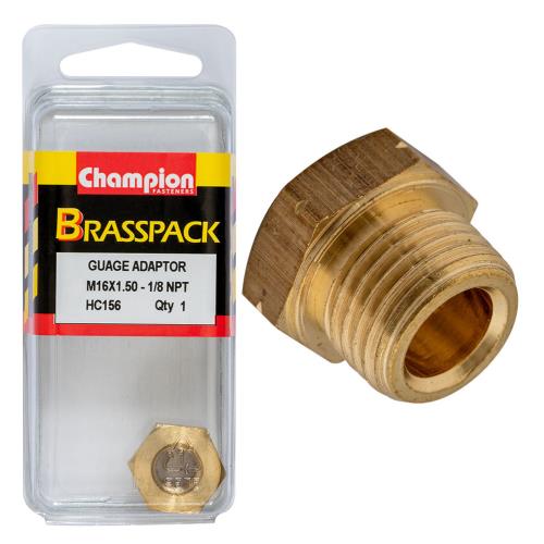 HC156 | Champion Brass Gauge Adaptor M16x1.50 Male to 1/8 NPT Female Specification • Brass • M16 x 1.50 male to 1/8in NPT female • Pack Size: 1
