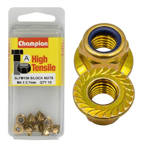 SLFM156 | Champion Hex Flange Self-Locking Nuts Nylon Insert M4x0.7mm Specification • Self-Locking Nylon Insert • Flange • M4 x 0.7mm • METRIC • Zinc Plated • HIGH TENSILE GRADE 8.8 • Pack Size: 10