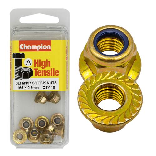 SLFM157 | Champion Hex Flange Self-Locking Nuts Nylon Insert M5x0.8mm Specification • Self-Locking Nylon Insert • Flange • M5 x 0.8mm • METRIC • Zinc Plated • HIGH TENSILE GRADE 8.8 • Pack Size: 10