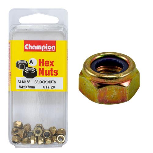 SLM156 | Champion Hex Nut Self Locking Nylon Insert M4x0.7mm - 20pk Specification • Self-Locking Nylon Insert • M4 x 0.7mm • METRIC • Zinc Plated • HIGH TENSILE GRADE 8.8 • Pack Size: 20