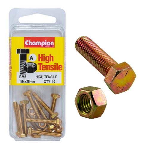 BM5 | Champion Hex Set Screw High Tensile M4x25mm Grade 8.8 - 10pk Specification • M4x25mm • METRIC • Zinc Plated • HIGH TENSILE GRADE 8.8 • Pack Size: 10
