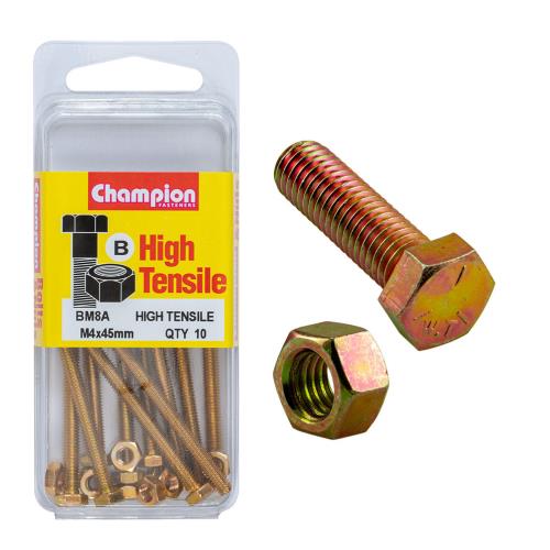 BM8A | Champion Hex Set Screw High Tensile M4x45mm Grade 8.8 - 10pk Specification • M4x45mm • METRIC • Zinc Plated • HIGH TENSILE GRADE 8.8 • Pack Size: 10