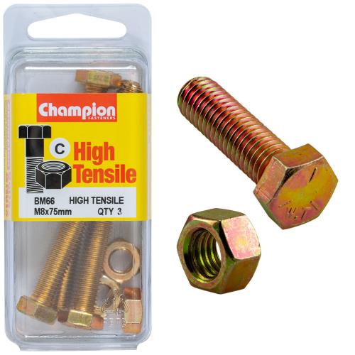 BM66 | Champion M8 x 75 Hex Set Screw High Tensile - GR8.8 Specifications • M8 x 75mm • METRIC • Zinc Plated • HIGH TENSILE GRADE 8.8 • Pack Size: 3