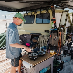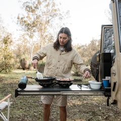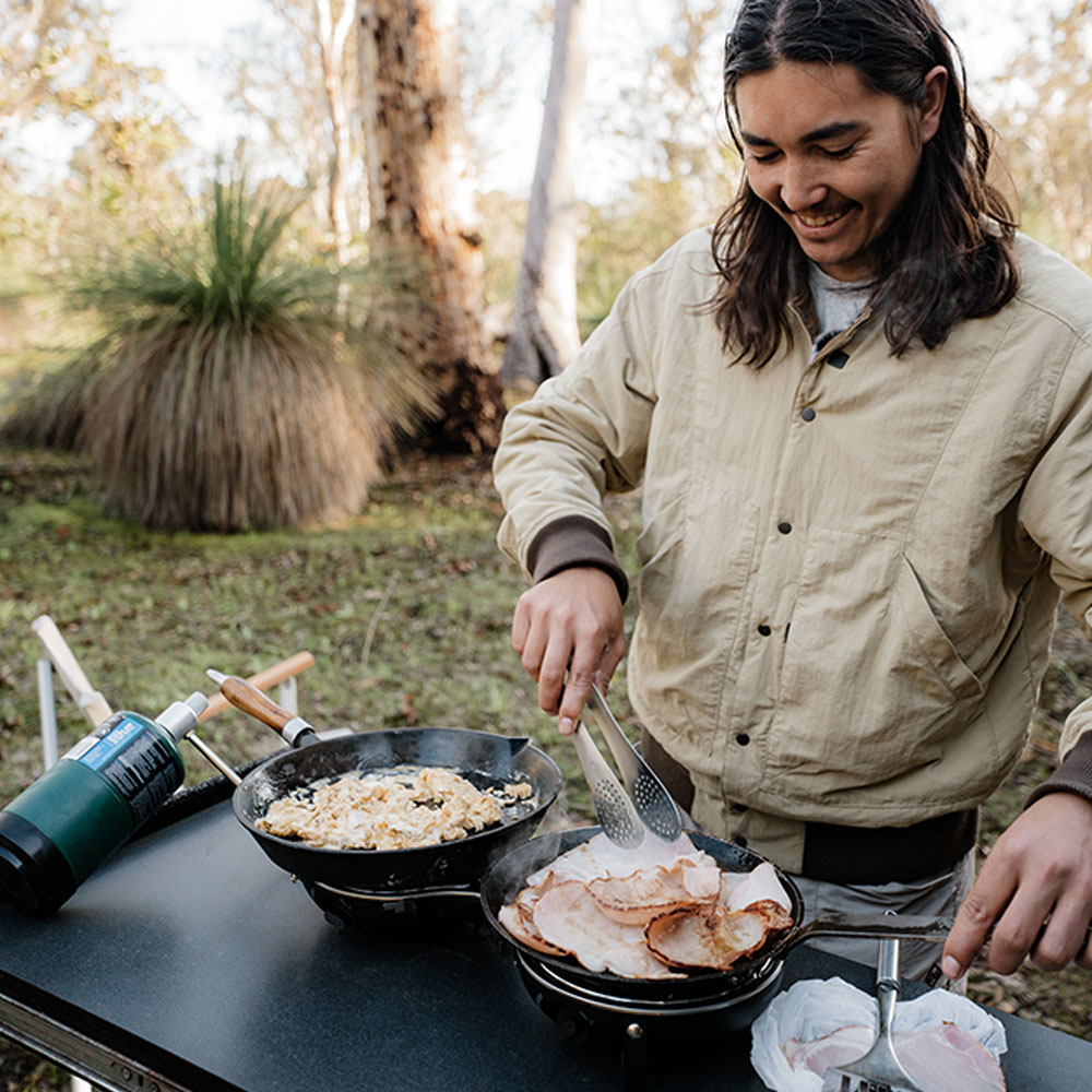 The stove is delivered in a recyclable box, complete with a gas hose and manual. Only a gas bottle is required. The smart nomadiQ stove has two very powerful burners (8600BTU) with two independent temperature controls and is easy to clean after use.