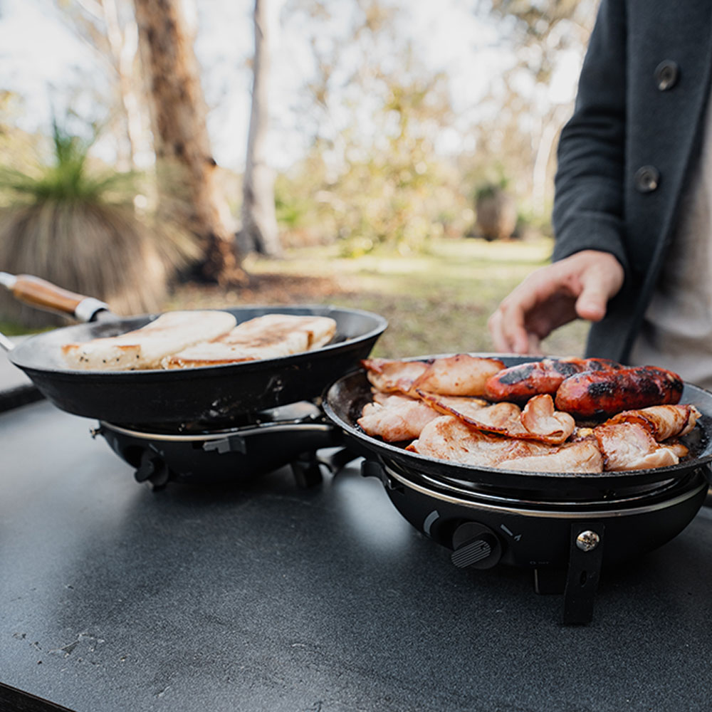 The stove is delivered in a recyclable box, complete with a gas hose and manual. Only a gas bottle is required. The smart nomadiQ stove has two very powerful burners (8600BTU) with two independent temperature controls and is easy to clean after use.